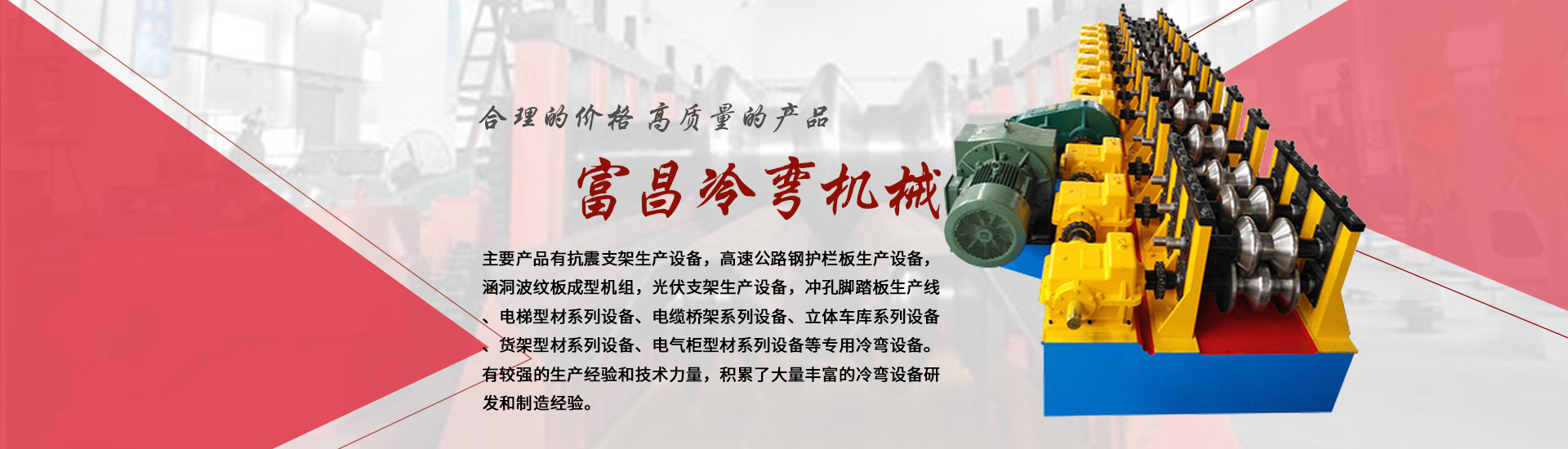 主要產品有抗震支架生產設備,高速公路鋼護欄板生產設備,涵洞波紋板成型機組,光伏支架生產設備,沖孔腳踏板生產線、電梯型材系列設備、電纜橋架系列設備、立體車庫系列設備、貨架型材系列設備、電氣柜型材系列設備等專用冷彎設備。有較強的生產經驗和技術力量,積累了大量豐富的冷彎設備研發和制造經驗。